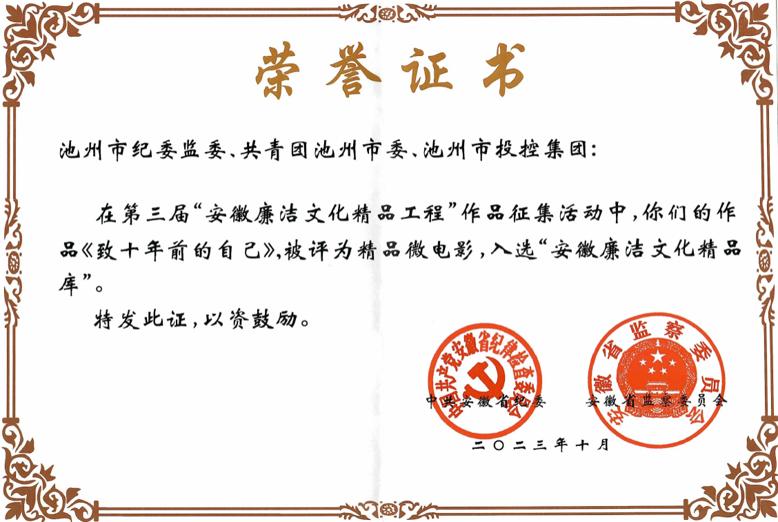 據悉,在第三屆“安徽廉潔文化精品工程”作品征集活動中,池州市紀委監(jiān)委、共青團池州市委、池州市投控集團聯合攝制的廉潔微電影《致十年前的自己》,被評為精品微電影,入選“安徽廉潔文化精品庫”。
