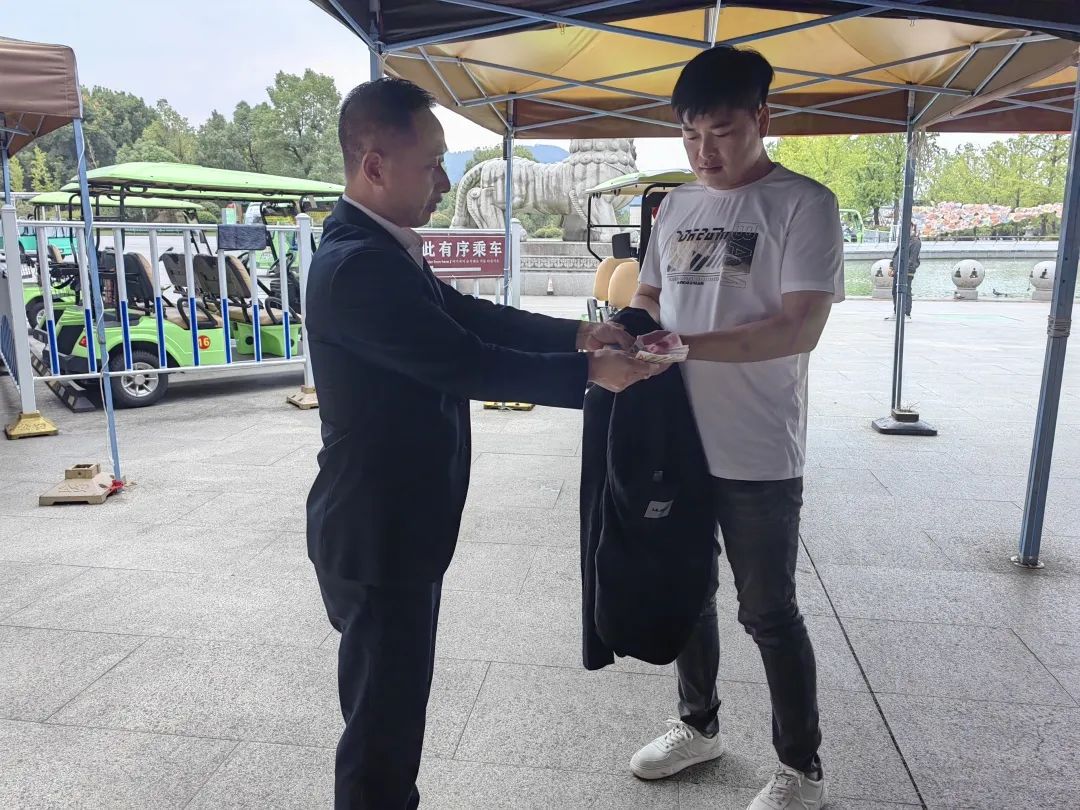 游客胡先生通過景區(qū)工作人員得知自己的外套在觀光車起點站,隨身物品保存完好,十分激動,收到衣物后連聲道謝。趙小平回應(yīng)稱:“在我們景區(qū),任何一位員工,拾到游客財物都會主動歸還游客的。”
