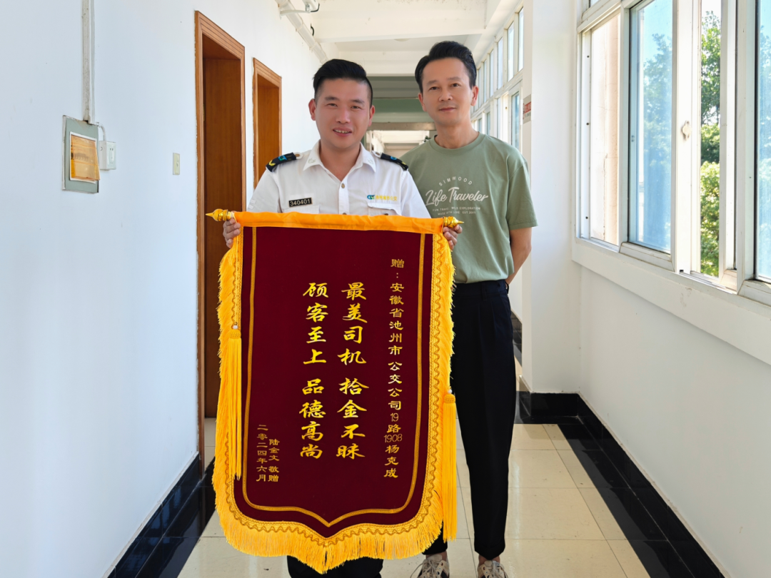 6月25日下午,池州市城市公共交通有限公司收到了乘客陸先生從河北郵寄來(lái)的一面錦旗。6月23日早上7:40分,城市公交客服熱線接到了乘客陸先生打來(lái)的電話(huà),陸先生表示自己的手機(jī)和身份證丟了,半小時(shí)前乘坐過(guò)19路公交車(chē)。調(diào)度員在了解情況后立刻通過(guò)調(diào)度系統(tǒng)鎖定車(chē)輛并聯(lián)系公交師傅。楊克成師傅在靠站后找到了一個(gè)手機(jī)和一個(gè)身份證,立刻拍照發(fā)給調(diào)度中心進(jìn)行了核實(shí),并對(duì)物品進(jìn)行了保管。上午10:30分,陸先生在1908車(chē)楊克成師傅手上接過(guò)了自己遺失的手機(jī)和身份證,激動(dòng)萬(wàn)分,表示手機(jī)里的文件非常重要,能夠這么快完好無(wú)損的找回來(lái)自己很開(kāi)心,非常感謝楊師傅。楊師傅表示“拾金不昧,物歸原主”是自己作為駕駛員應(yīng)該做的,哪怕是一根針一根線我們找到了都會(huì)保管好還給乘客。